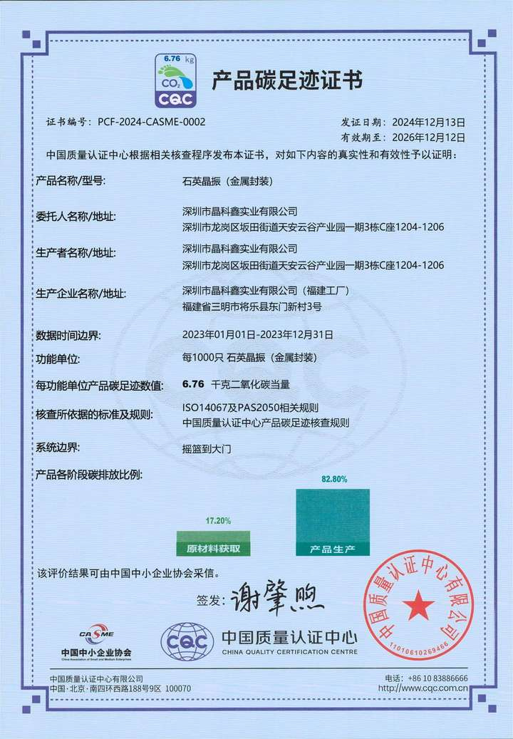 The carbon footprint certification is a major step in Shenzhen Crystal Technology green transformation journey. We remain committed to driving low-carbon innovation and setting benchmarks in the Crystal Resonator and Oscillator industry, contributing to global climate governance. Together with customers, partners, and society, we aim to create a sustainable, eco-friendly future.